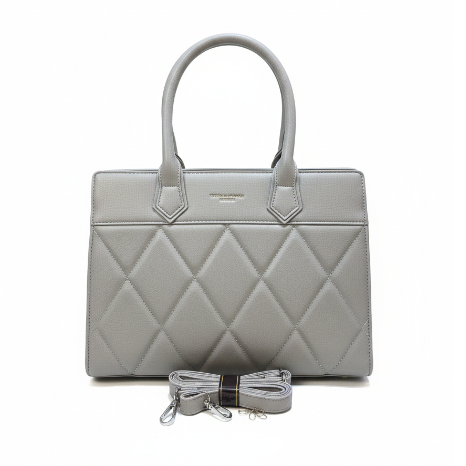 The grey carryall provides a refined, neutral alternative that exudes quiet luxury and professional charm. Its muted tones highlight the intricate quilted craftsmanship and metallic hardware, making it an ideal companion for both office wear and weekend outings. This bag is perfect for achieving a clean, minimalist look that remains timeless.